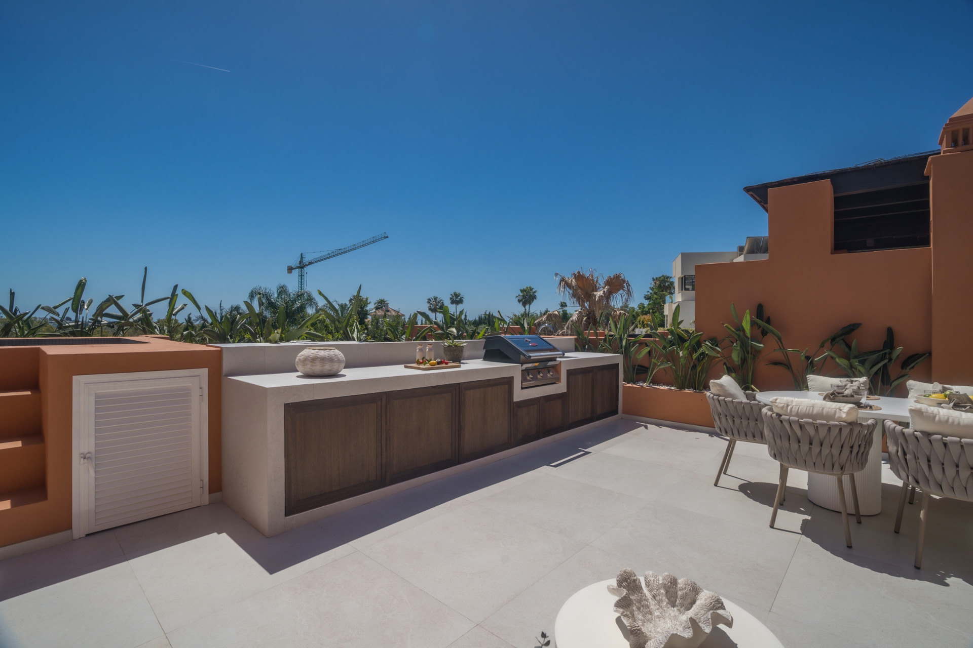 The staircase leads to the master suite with a walk-in closet, spacious bathroom, and access to the grand terrace. This terrace is fully equipped for alfresco living with a plunge pool, outdoor kitchen with BBQ, large dining area, and generous lounge space. It is south-facing and designed for comfort and style. Additional features include a garage with space for two vehicles.
