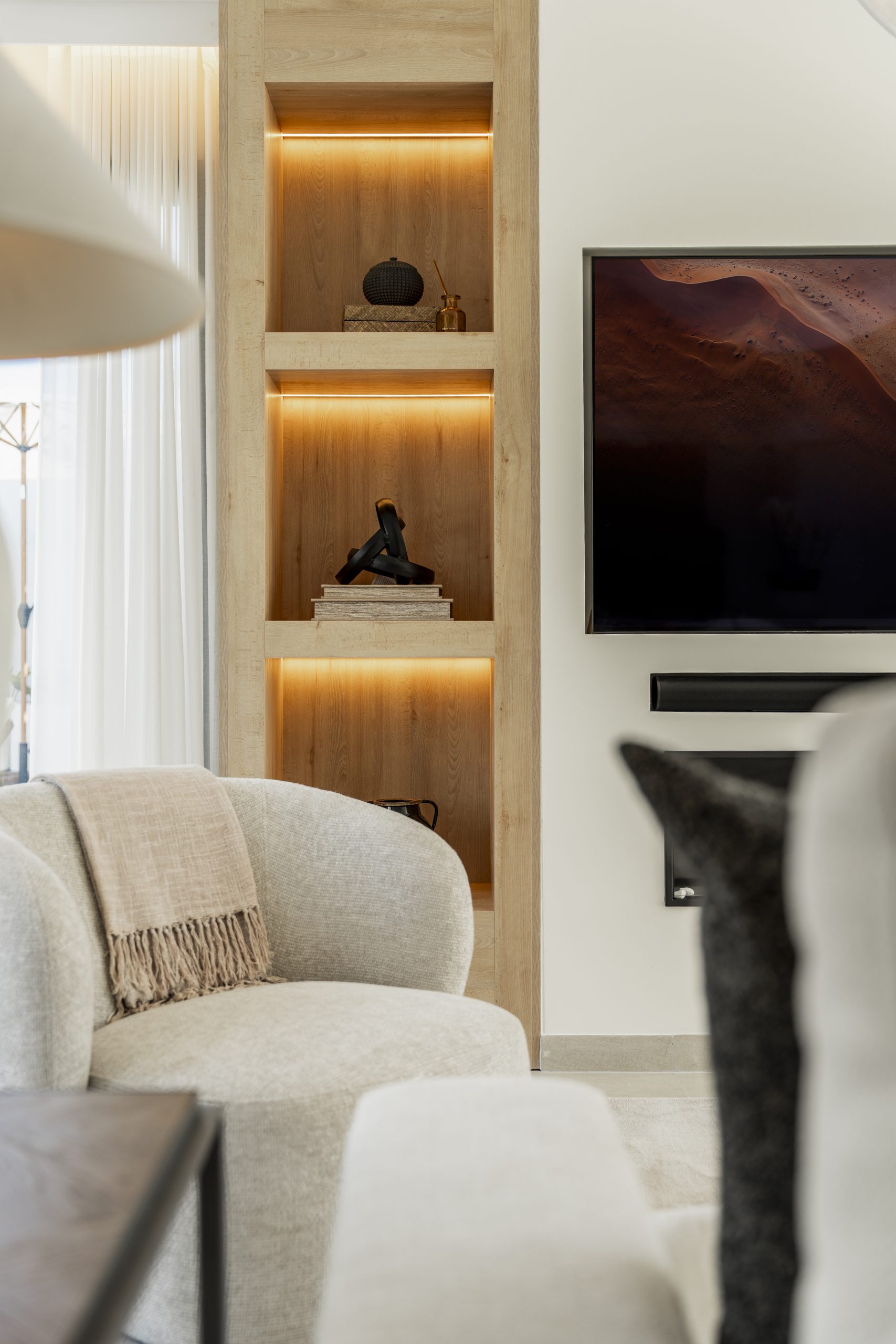 The main living spaces connect easily to the outdoor areas, allowing for a relaxed and open atmosphere. Large terraces offer plenty of room for outdoor dining, sunbathing, or simply enjoying the surroundings. The garden has been designed to be easy to maintain while still providing a pleasant setting around the house. An outdoor gym area adds a practical feature for anyone who values an active lifestyle without leaving home.